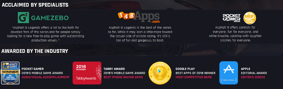 자체 개발 제품으로는 "아스팔트 9", "드래곤 매니아 레전드", "아이스에이지", "토르:다크월드" 와 같은 성공적인 게임이 있습니다. Gameloft의 "미니언 러쉬", "아스팔트 8:에어본"은 앱 애니(App Annie)의 "세계 역대 다운로드 상위 10대 iOS 게임"에 포함되었고, "아스팔트 9: 레전드"는 애플과 웹비 어워드(Webby Awards)로부터 디자인 상을 받았습니다. 게임로프트는 세계 최고의 게임 회사 목록에서 쉽게 찾아 볼 수 있습니다.