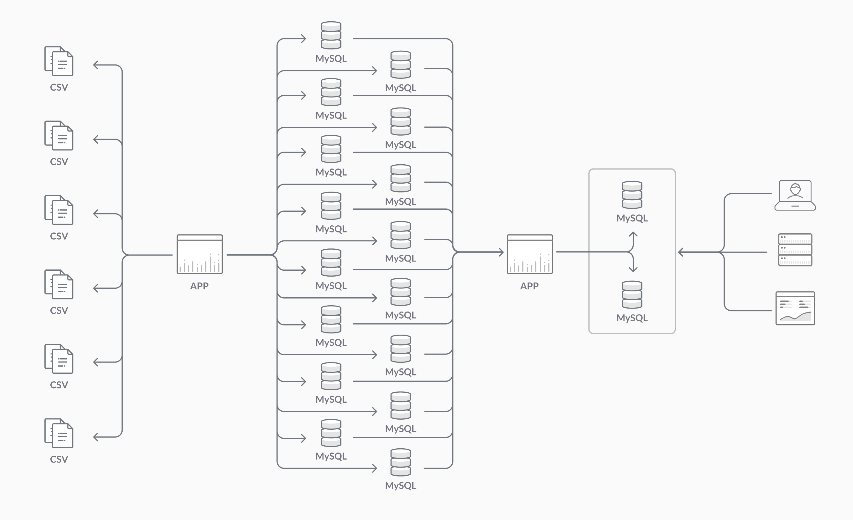 데이터가 MySQL 클러스터에 도달하기 전에 게임로프트는 MooseFS라는 오픈소스 기술을 사용하여, 들어오는 KPI 데이터를 서버에서 임시저장을 했습니다.(MooseFS : 내결함성, 고가용성, 수평 확장 분산 파일 시스템). 그런 다음 ETL 작업은 MooseFS에서 데이터를 처리하여 MySQL 클러스터에 저장하기 전에 데이터를 읽고 변환하여 분석에 사용할 수 있도록 했습니다.
