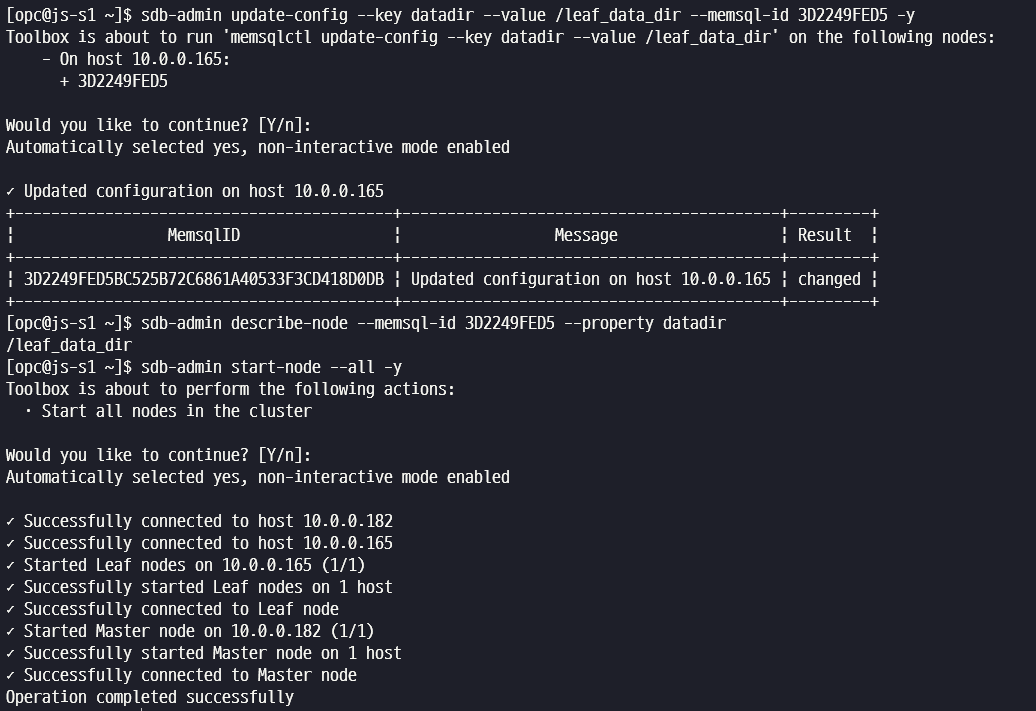 sdb-admin update-config 명령어로 Leaf 노드의 memsql.cnf 에 변경내용을 반영한 후 describe-node 명령어로 확인합니다. 정상적으로 변경되었다면 모든 노드를 Start 시킵니다.