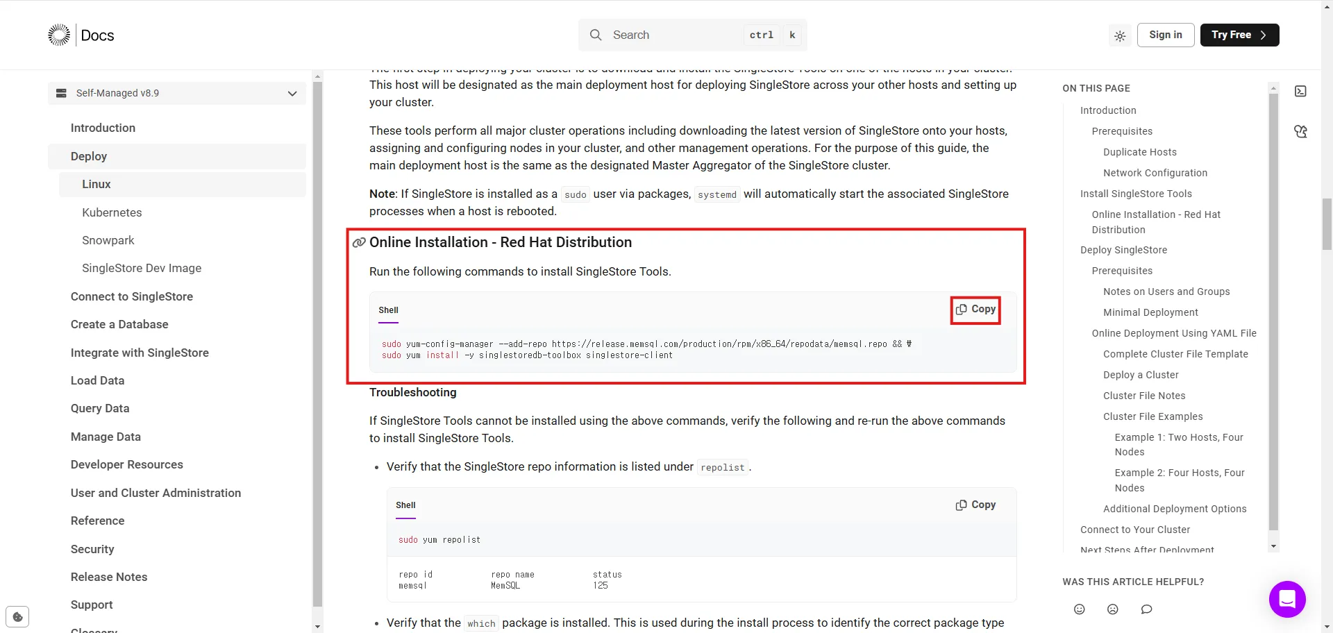 sudo yum install -y singlestoredb-toolbox singlestore-client