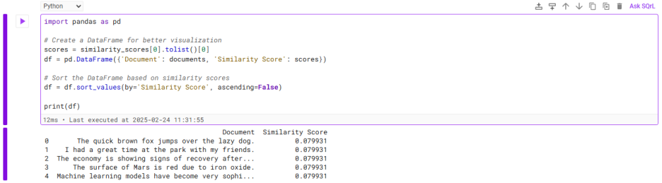 테이블 형식을 선호하는 경우 pandas를 사용하여 문서와 유사성 점수를 표시하는 DataFrame을 만들 수 있습니다.