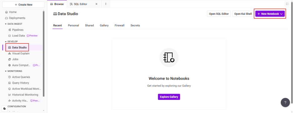 스튜디오 에서 New Notebook 클릭 해서 새 SingleStore Notebooks를 생성해 줍니다.