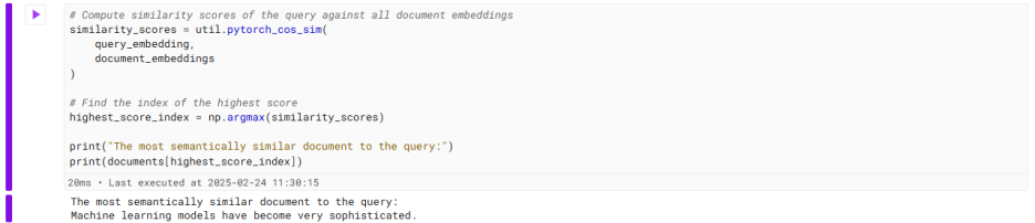 이 예제에서 모델은 기계 학습 모델을 말하는 문서가 자연어 처리 모델에 대한 쿼리와 의미상 가장 유사하다고 결정했습니다.