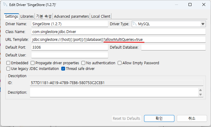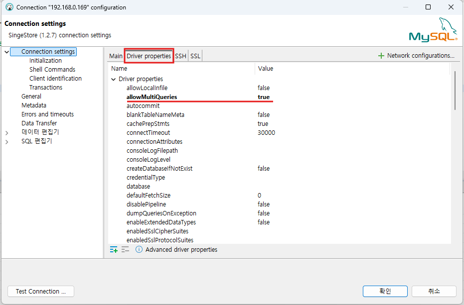 Driver properties 선택 allowMultiQueries 값을 true로 변경