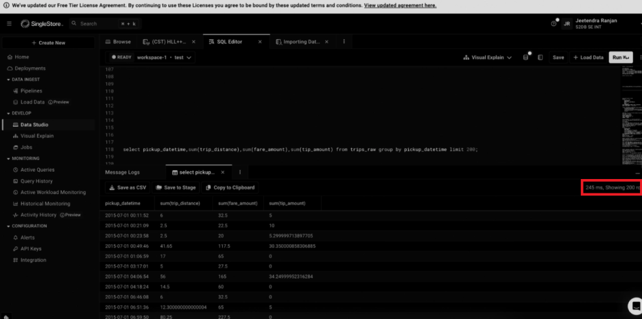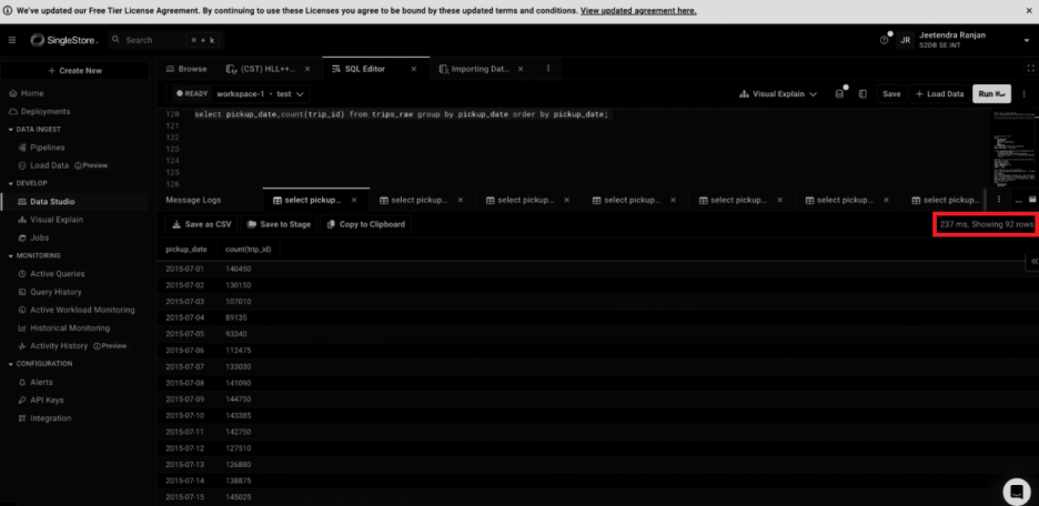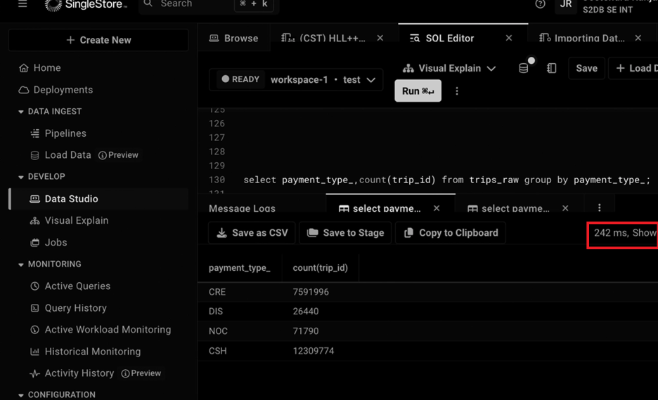SingleStore 로드 시간: 134초