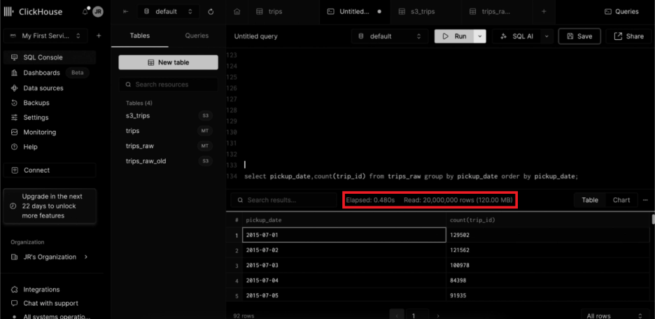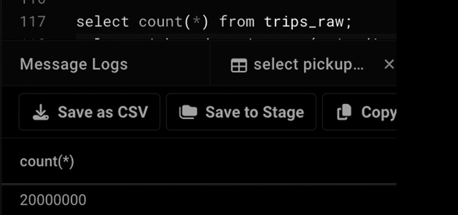 select pickup_date,count(trip_id) from trips_raw group by pickup_date order by pickup_date;