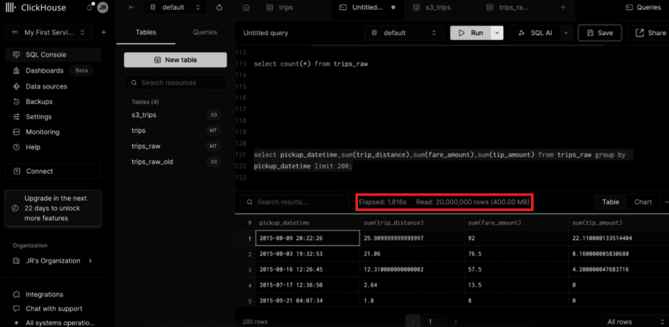 select pickup_datetime,sum(trip_distance),sum(fare_amount),sum(tip_amount)from trips_raw group by pickup_datetime;