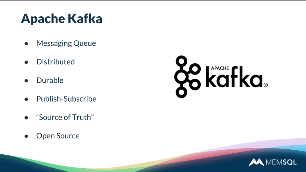 Kafka는 공개 구독 모델에서 작동하는 오픈 소스 메시징 큐입니다. SingleStore와 같이 분산형 구조이고 내구성을 제공합니다. Kafka는 조직 전체의 데이터에 대한 사실의 출처(a source of truth)이 될 수 있습니다.