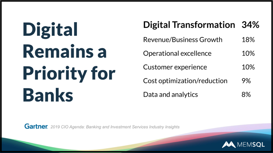 가트너 조사에 따르면 디지털 혁신은 은행의 최우선 순위이며 다른 순위보다 거의 2배의 관심을 가지고 있습니다. 또한 이는 매출과 비즈니스 성장, 운영 효율성, 고객 경험, 비용 최적화와 절감, 데이터 및 분석 등 다른 모든 우선순위에 있어 중요한 요소 중 하나입니다.