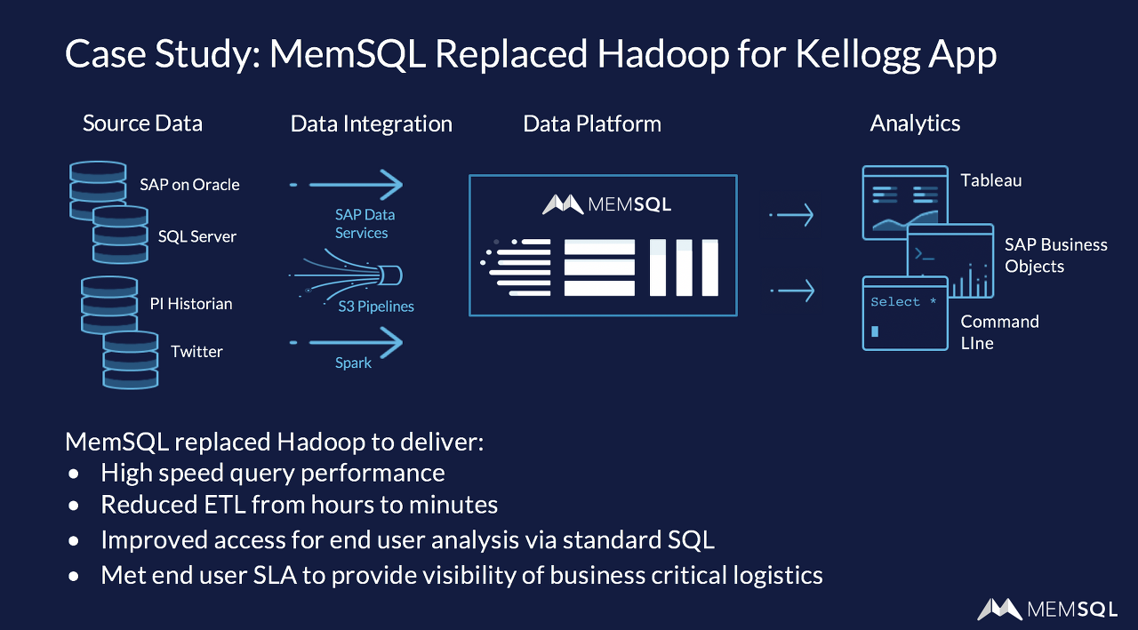 Webinar에는 식품 회사 인 Kellogg가 Hadoop과 Hive를 SingleStore로 대체 한 방법에 대한 사례 연구가 포함되어 있습니다. 훨씬 빠른 쿼리 성능, 몇 시간이 아닌 몇 분 만에 ETL과 같은 처리 및 SQL을 다시 사용할 수 있습니다.