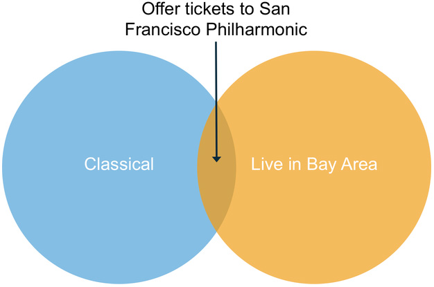 여러 사용자 세그먼트 간의 중복을 알면 타겟팅에 대한 새로운 기회가 열립니다. 예를 들어, 사용자는 클래식 음악의 팬이고 샌프란시스코 만 지역에 살고 있다는 것을 알면 샌프란시스코 심포니 티켓 광고를 낼 수 있습니다. 이 광고는 대다수의 청중과 관련이 없지만, 이 특정 "중복" 부문에 대해 높은 비율로 전환될 수 있습니다. 비슷하게, 당신은 남부 캘리포니아의 클래식 팬들에게 LA 필하모닉 티켓을 제공할 수 있습니다. 아웃사이드 랜즈 티켓은 베이 지역의 락앤롤 팬에게 제공합니다.