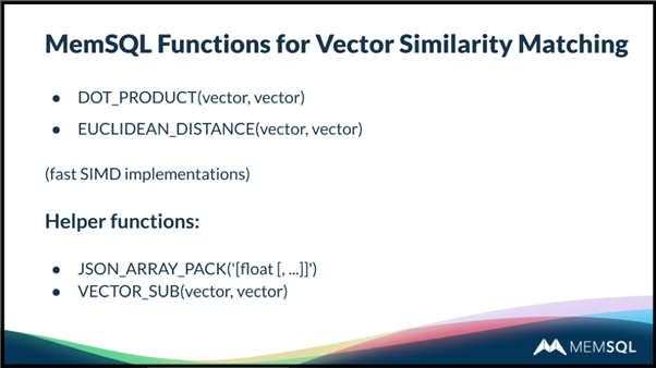 SingleStore는 두 벡터에 대한 유사율을 확인하기 위한 벡터함수를 제공합니다. DOT_PRODUCT 와 EUCLIDEAN_DISTANCE입니다. 이 두 벡터함수는 고속 고성능의 SIMD(Single-Instruction, Multiple-Data)를 구현하므로 하드웨어가 AVX2 명령어를 지원해야 합니다.