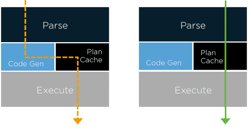 메모리 내 시스템에서 디스크 I/O 병목 현상이 제거되면 동적 SQL 해석이 최대 성능에 영향을 미칠 수 있을 정도로 쿼리가 매우 빠르게 실행됩니다. SingleStore는 SQL 문을 해석하고 컴파일된 쿼리 실행 계획으로 이를 해결합니다.