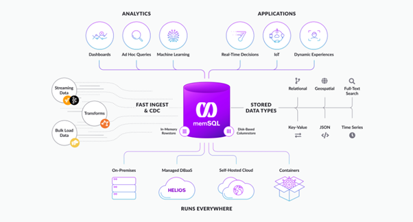 SingleStore와 같은 NewSQL 시스템은 확장성과 기능의 장점을 모두 가질 수 있게 해줍니다. 장애에 대해 내구성이 뛰어나고, 안전하며, 복구성이 뛰어나면서 개발자와 관리자에게 익숙한 인터페이스를 제공받을 수 있는 확장성이 뛰어난 클라우드 네이티브 시스템을 갖출 수 있습니다. SingleStore는 광범위한 기능과 ANSI SQL을 지원합니다. 또한 SingleStore는 정형, 반정형(JSON 저장과 JSON, AVRO 및 Parquet 수집), 네이티브 지리공간 인덱스와 Lucene 쿼리를 정형 쿼리에 포함시킬 수 있는 Lucene 기반의 풀 텍스트 인덱스(Full text index) 를 지원합니다. 그것은 현재 복잡한 분석 워크로드와 트랜잭션 및 운영 워크로드를 지원하는 로우스토어(Rowstore) 테이블과 컬럼스토어(Columnstore) 테이블을 모두 가지고 있습니다.
