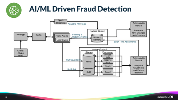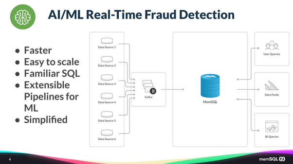 이 모든 것이 SingleStore내에서 분석이 수행되고 그 결과를 애플리케이션에 전달이 됩니다. 그 후, 애플리케이션은 결과를 이용하여 신용카드 거래를 수락할 지 거부할 지를 결정합니다. 또한 분석가들은 SingleStore를 사용하여 언제 어디에서 이상거래가 발생하는지 과거 데이터 분석을 수행합니다. 그들은 이제 실시간 신용카드 구매의 사용자 경험에 영향을 주지 않고 머신러닝 알고리즘을 실행하고 결과를 구매 시스템에 다시 리포팅하기 위한 서비스 수준 계약(SLA)을 충족할 수 있게 되었습니다.
