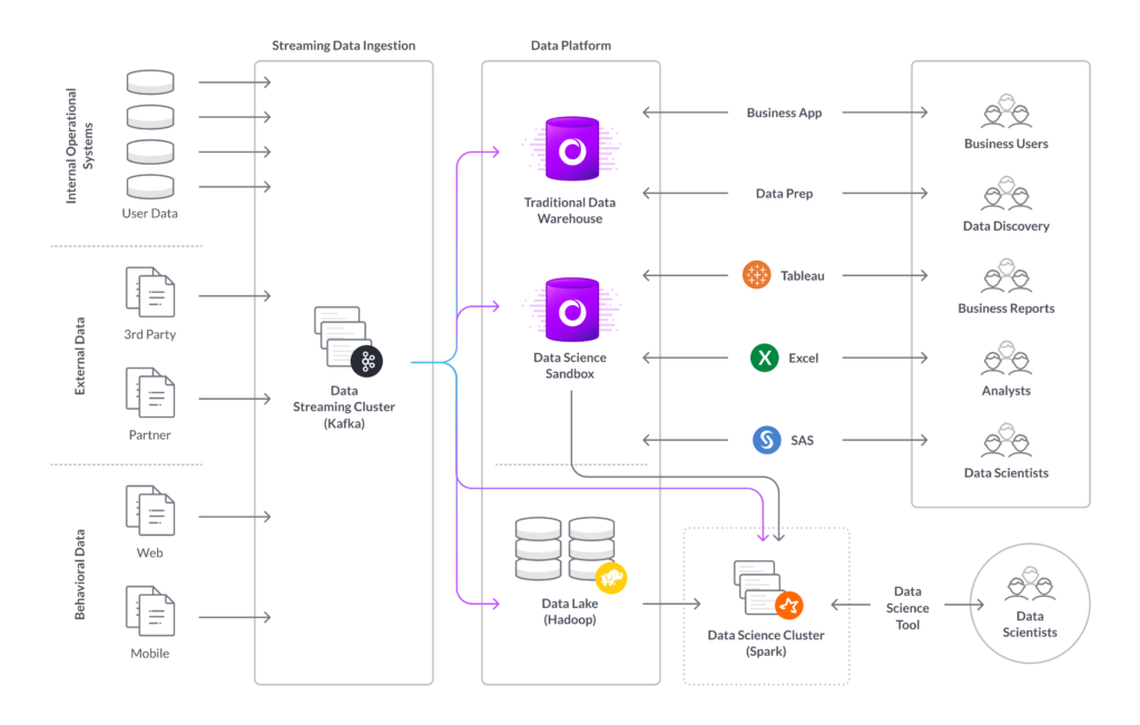 - Apache Hadoop기반 독립 실행형 데이터 레이크. 데이터 레이크는 분석 흐름에서 제거되어 데이터의 상위 집합을 저장하기 위해 사용되었습니다.