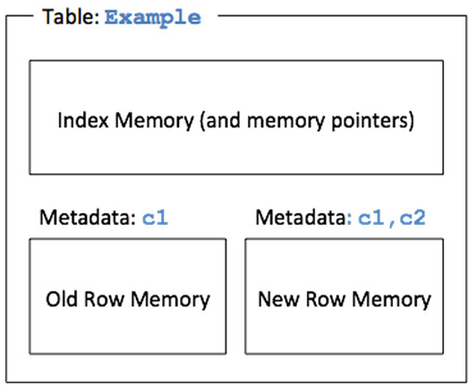 메타데이터 변경 시 “New Row Memory"을 영역을 설정하여 새 테이블 스키마에 대한 row를 할당한다. 새로 삽입된 row는 이 memory 영역에 할당된다. 원 테이블 row는 "Old Row Memory" 영역에 남아 있다.